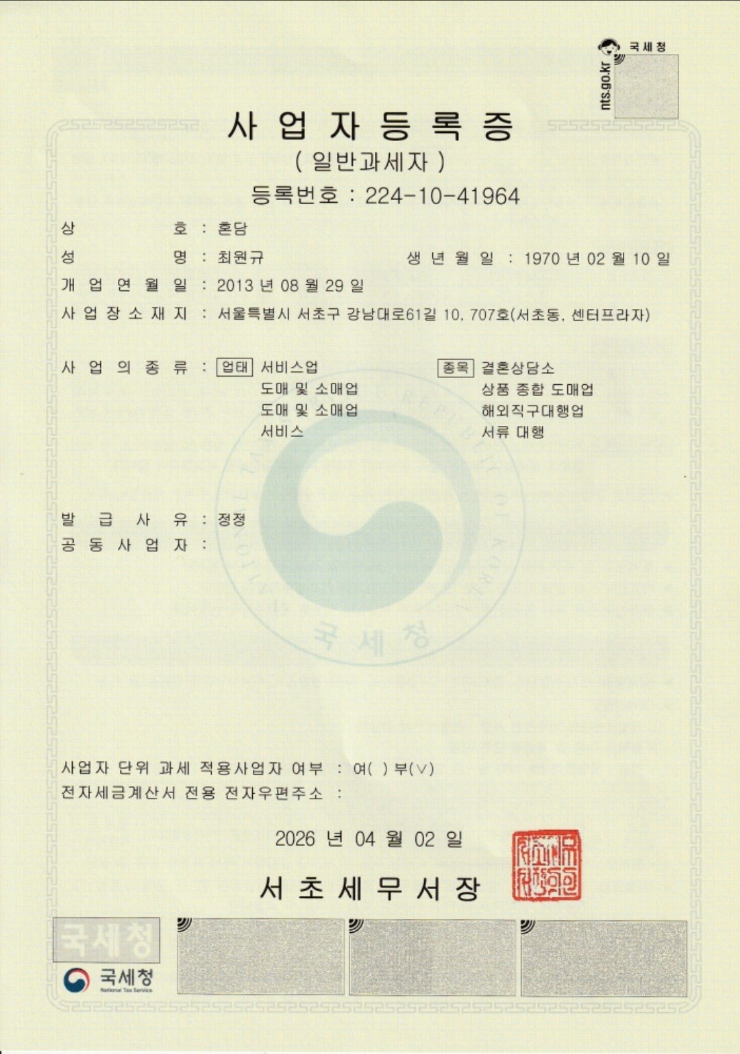 국제 결혼과 국제 결혼 서류 대행을 전문으로 서비스하고 있는 "혼담 / DS행정사"입니다.